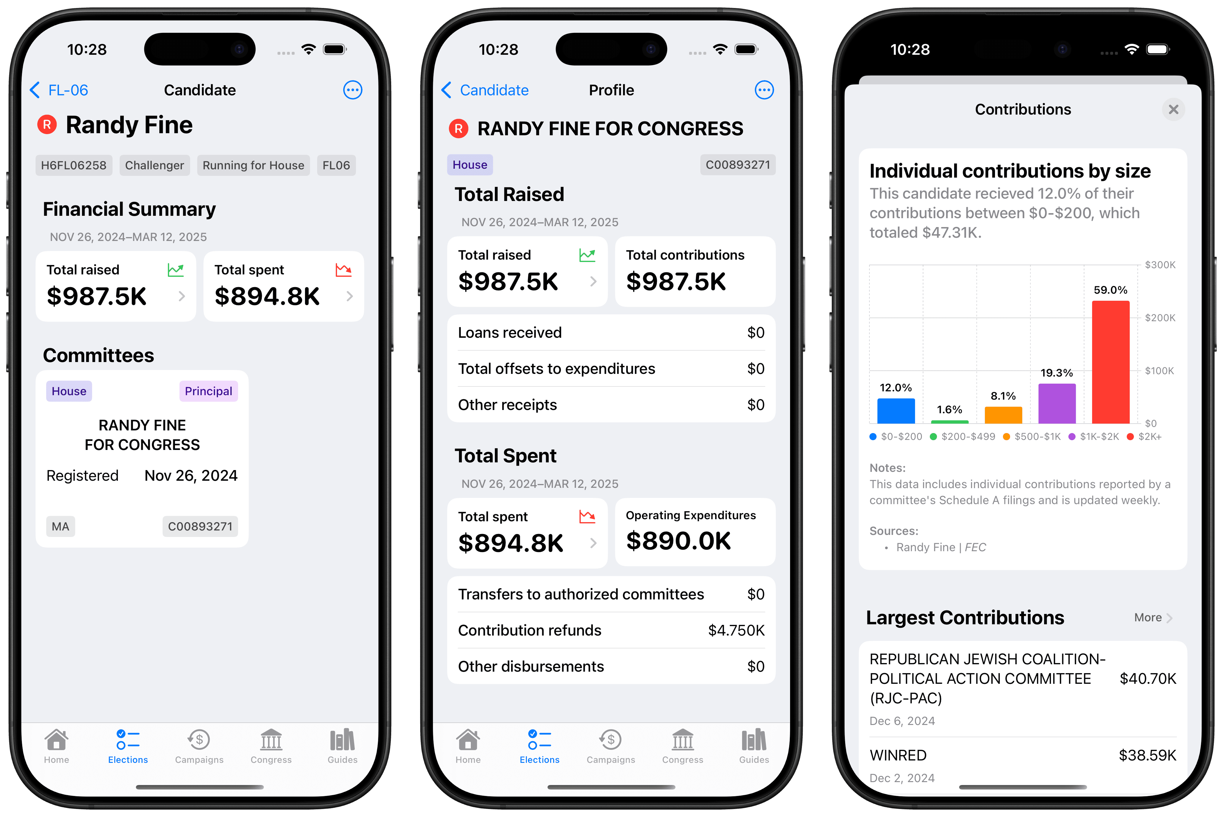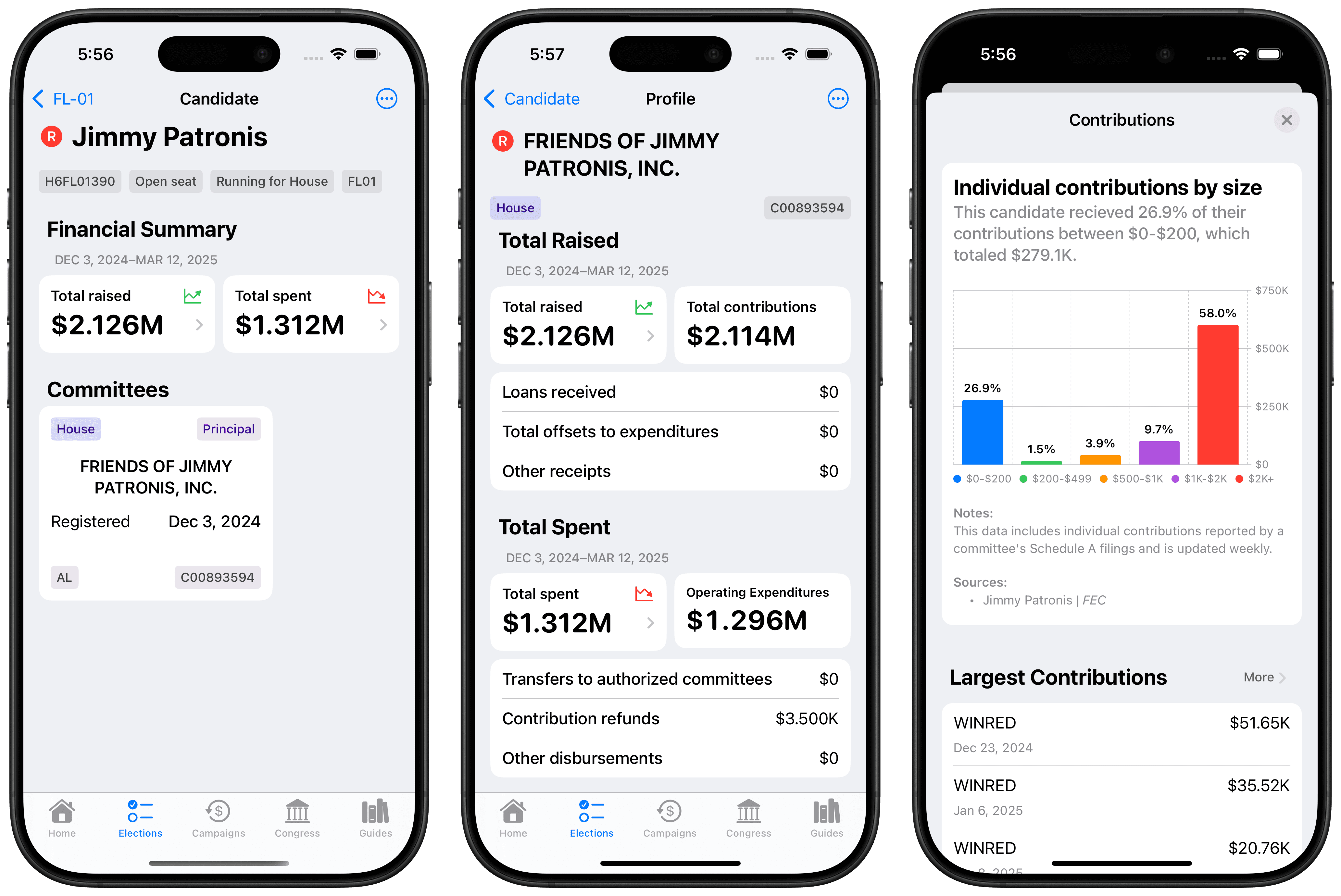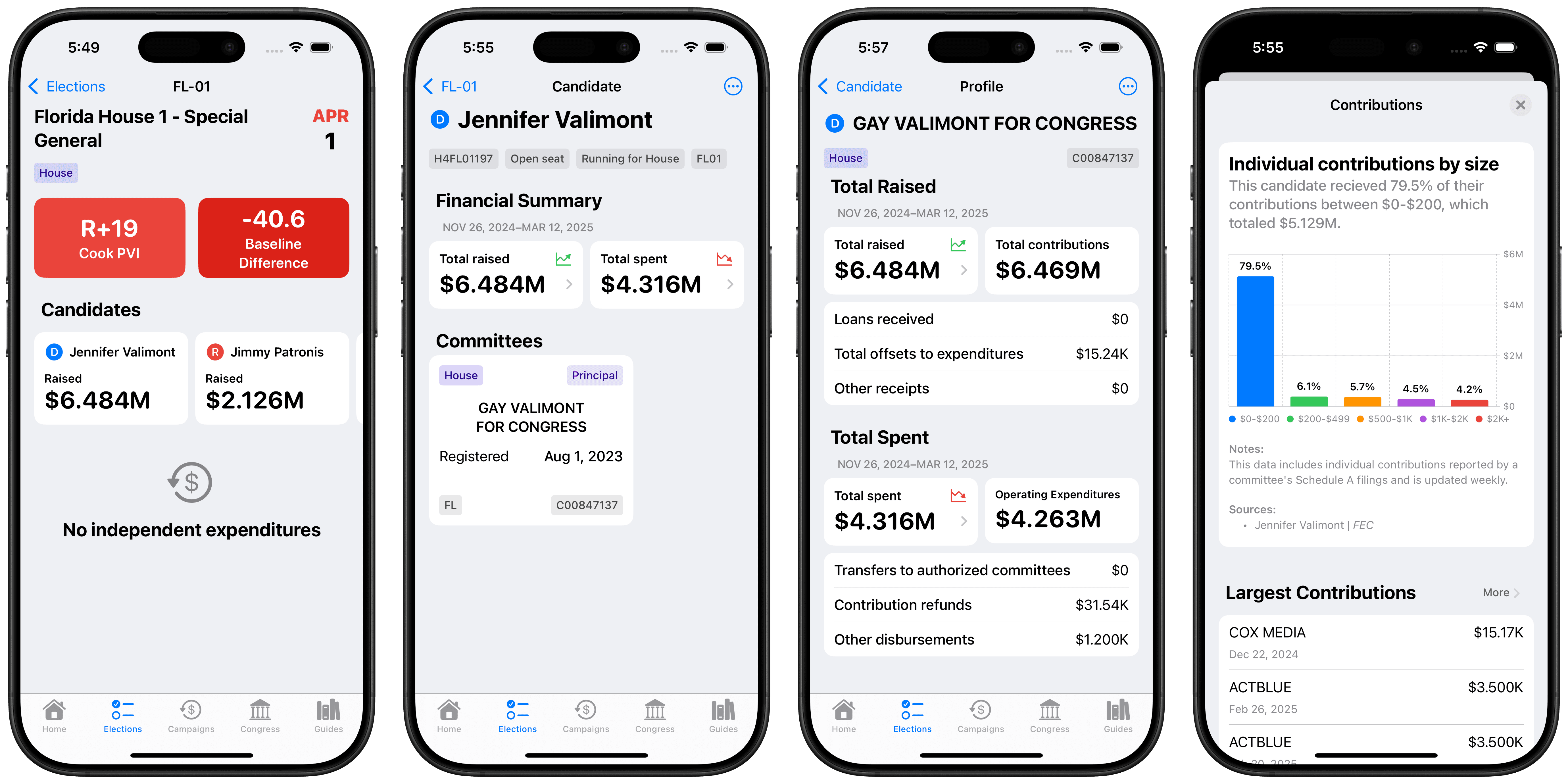 Tapping on each candidate’s card gives us more information. Valimont, who’s running as Gay Valimont, has spent $4.31M and her principal campaign committee is “Gay Valimont for Congress.” Most of Valimont’s donations have come from small amounts; about 80% of the total amount comes from contributions between $0-$200 and her largest contribution ($15K) came from Cox Media in December 2024.