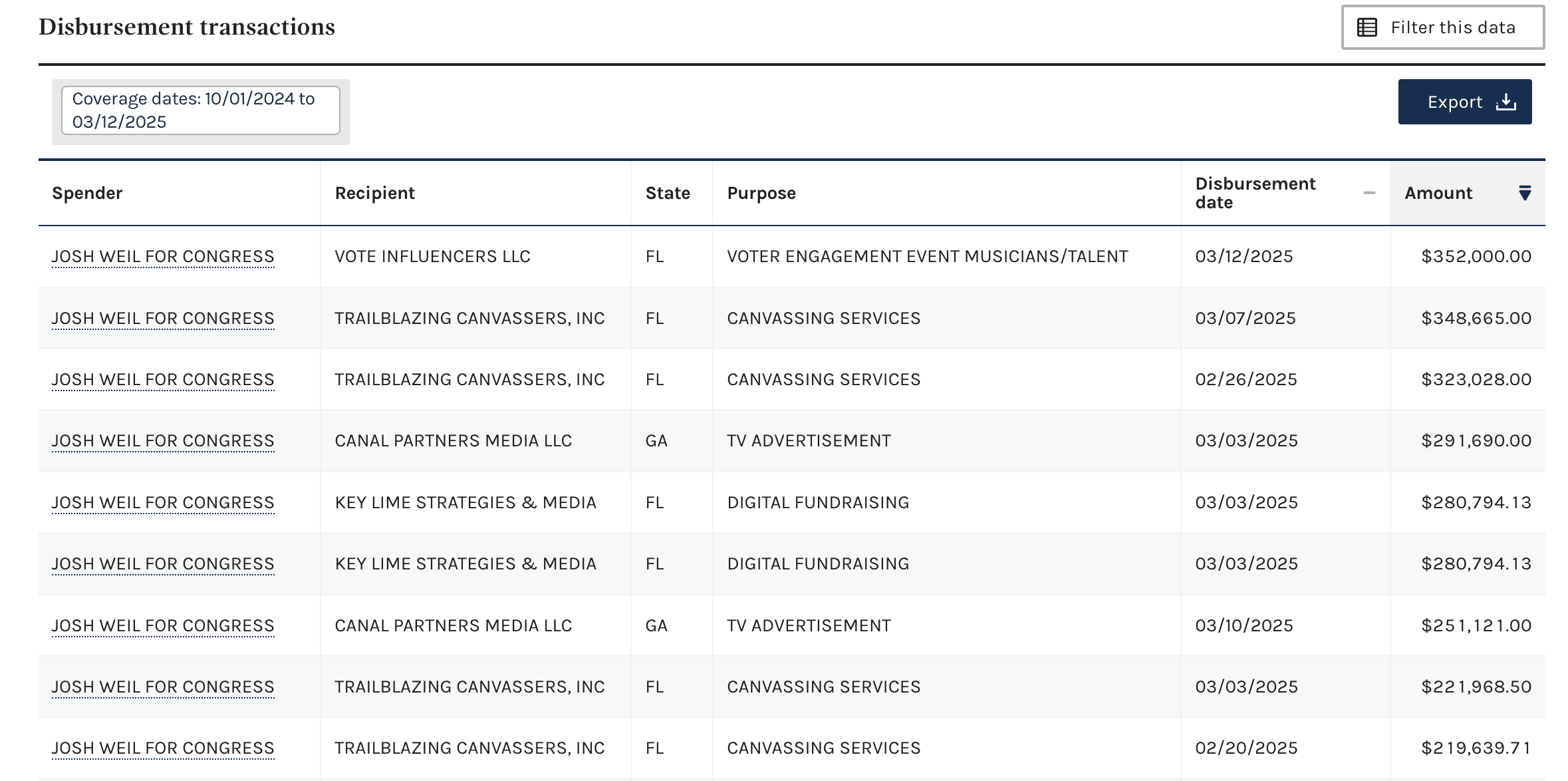 Weil has spent $8.2M and most (82%) of his contributions are in the $0-$200 amount while his two largest contributions are from Key Lime Strategies and Media for $280K and $66K. His largest disbursements are below, covering canvassing, TV ads, and a “voter engagement event”: