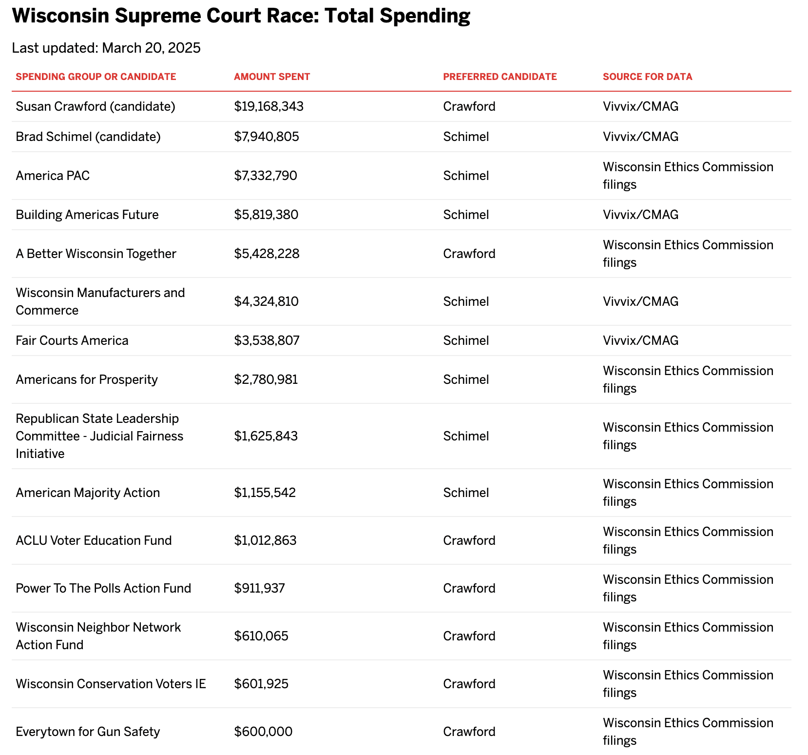 WisPolitics reports that Crawford’s campaign has spent roughly $17.6M while Schimel’s has spent $8.8M. The race has been making additional headlines since the involvement of Elon Musk and his affiliated committees. His America PAC, for instance, has spent at least $6.2M on canvassing and at least $6 million in spending by his political non-profit, Building America’s Future.