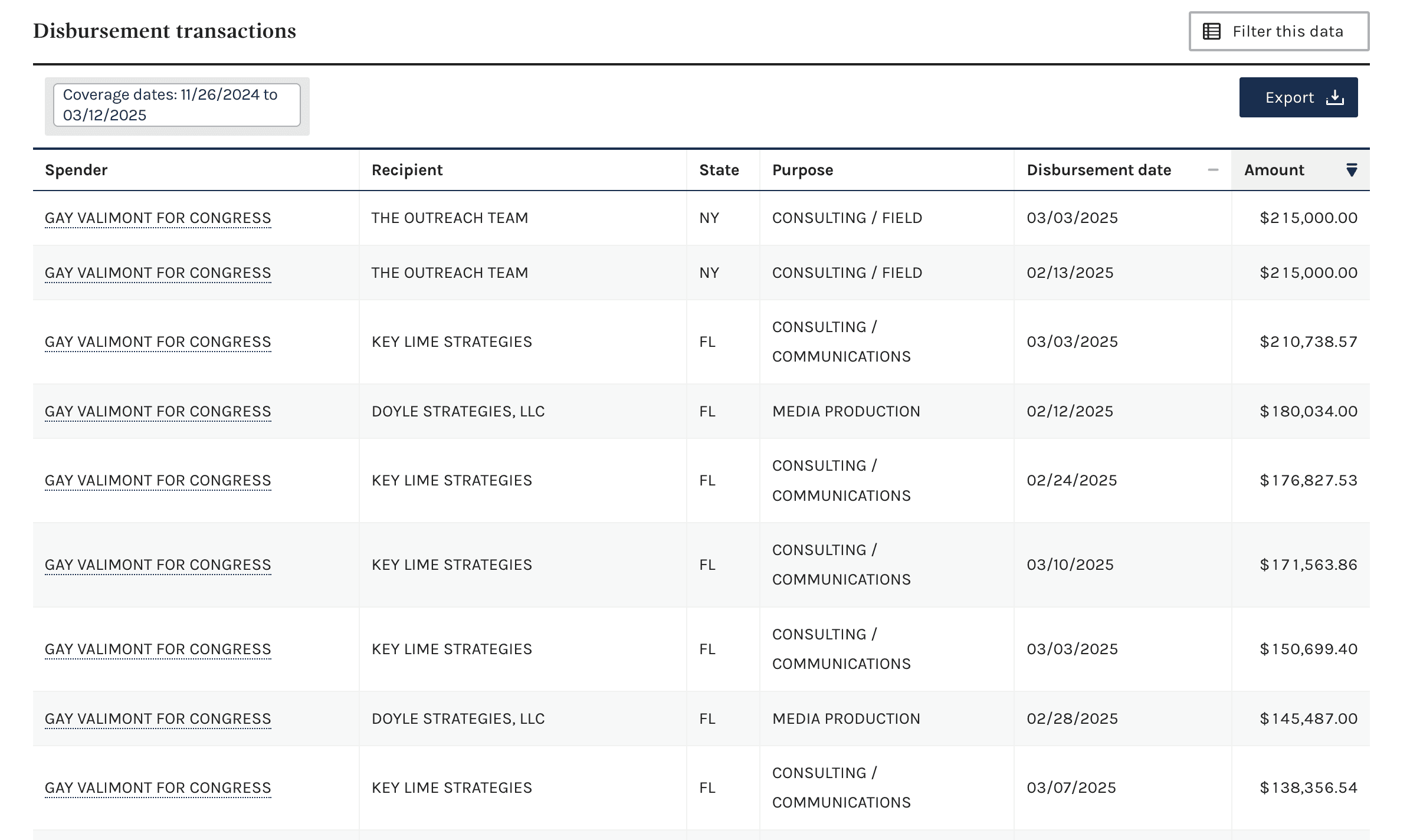 Valimont has spent $4.3M, but for some reason, it’s not showing up in the app (oops, I’ll take a look at that later). From the FEC, though, we can see her top disbursements, or expenses, most of which went to various consulting, media, and communications companies: